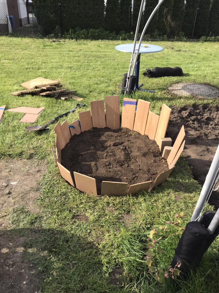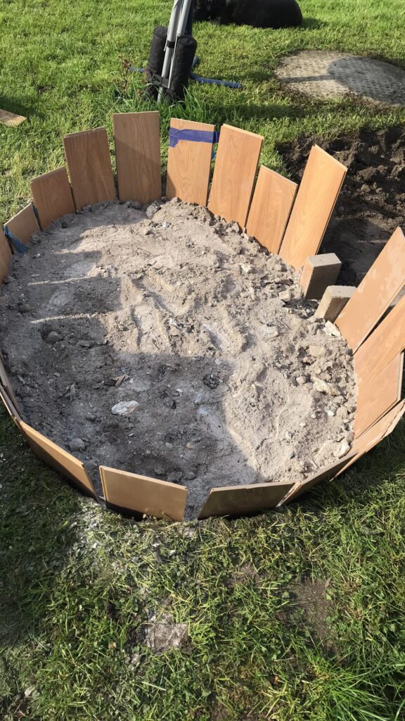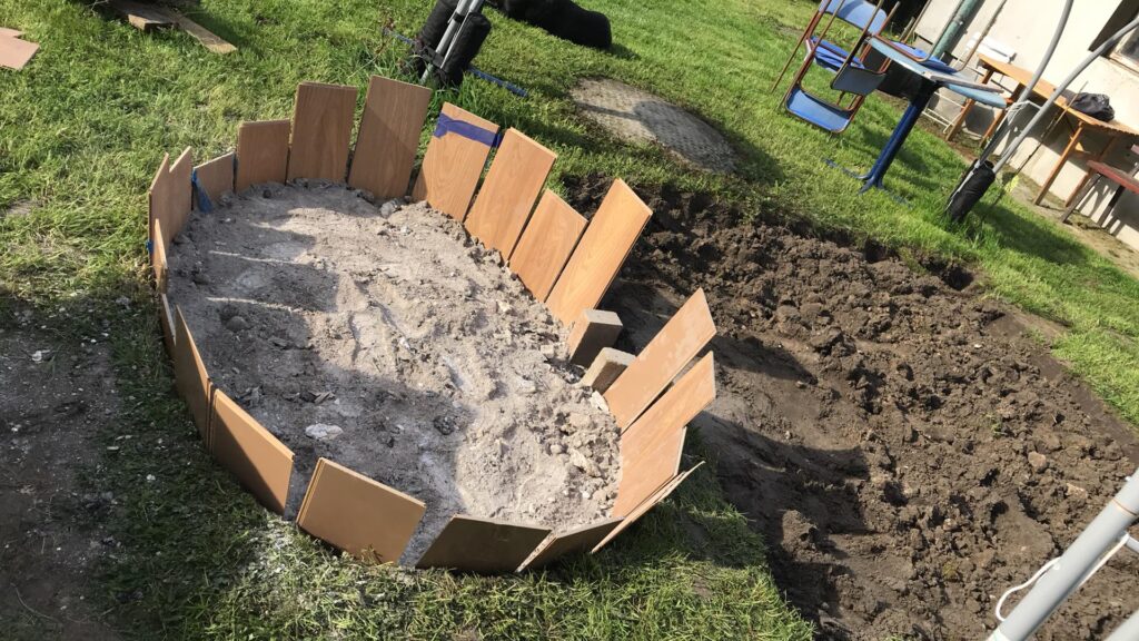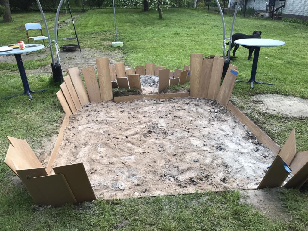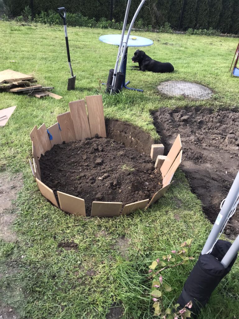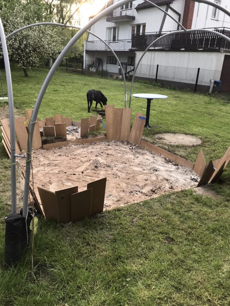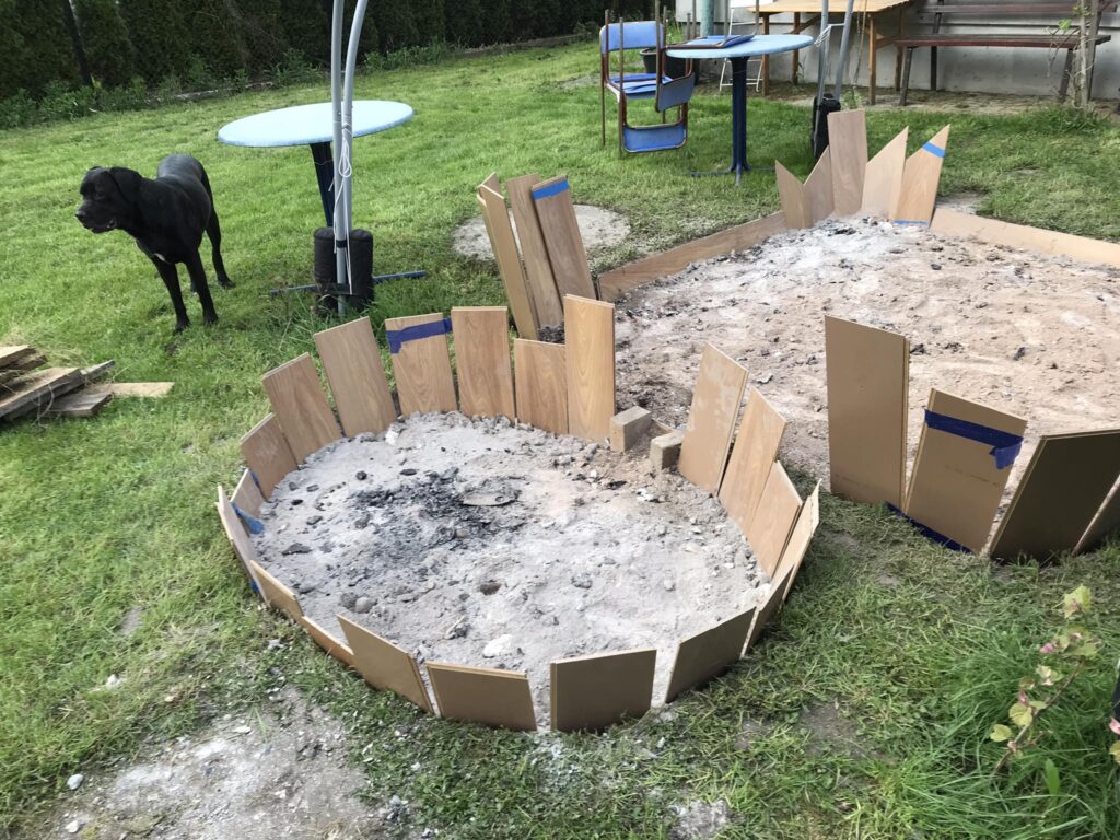 Zastanawiałam się jak zrobić okrąg do wylewki i jak później poukładać deski???? Odpowiedź brzmi: „jakoś to będzie”. Gdy już miałam wygrzebana ziemię rozpoczęłam poszukiwania odpowiednych desek do wykonania szalunku. Nic nie znalazłam oprócz ścinek z paneli, więc trzeba było ich użyć.