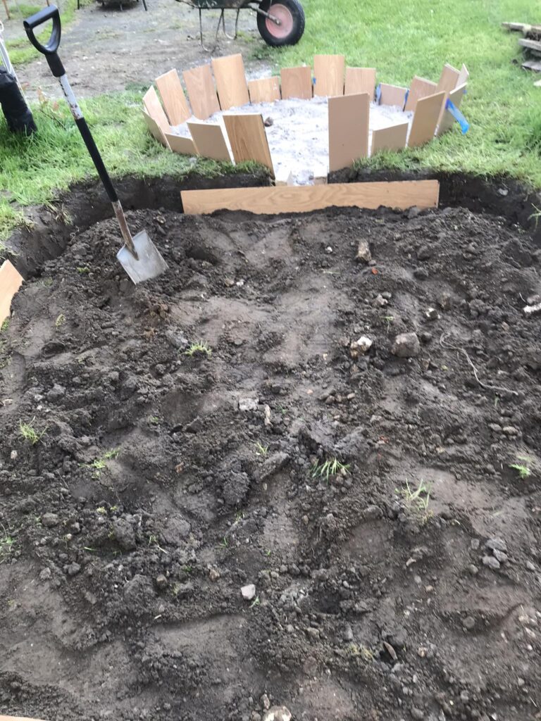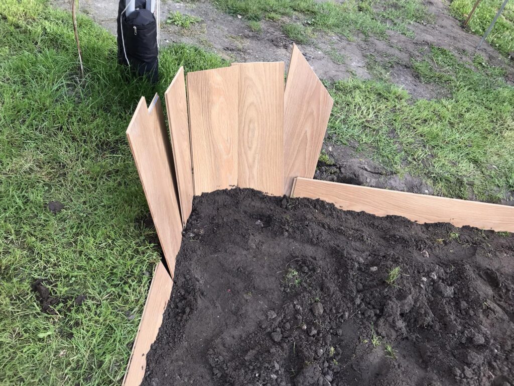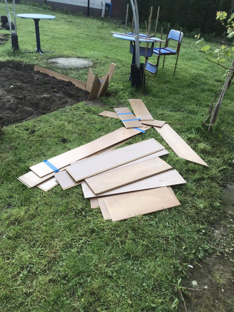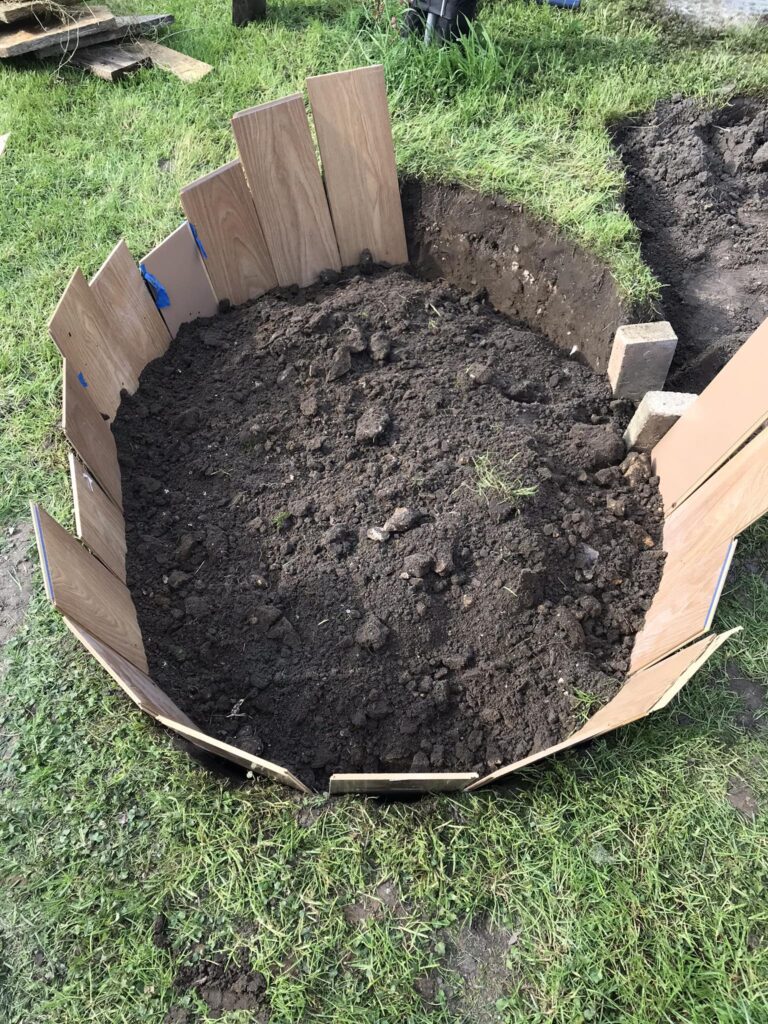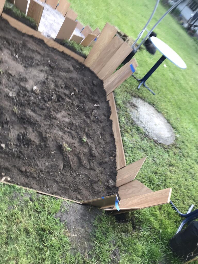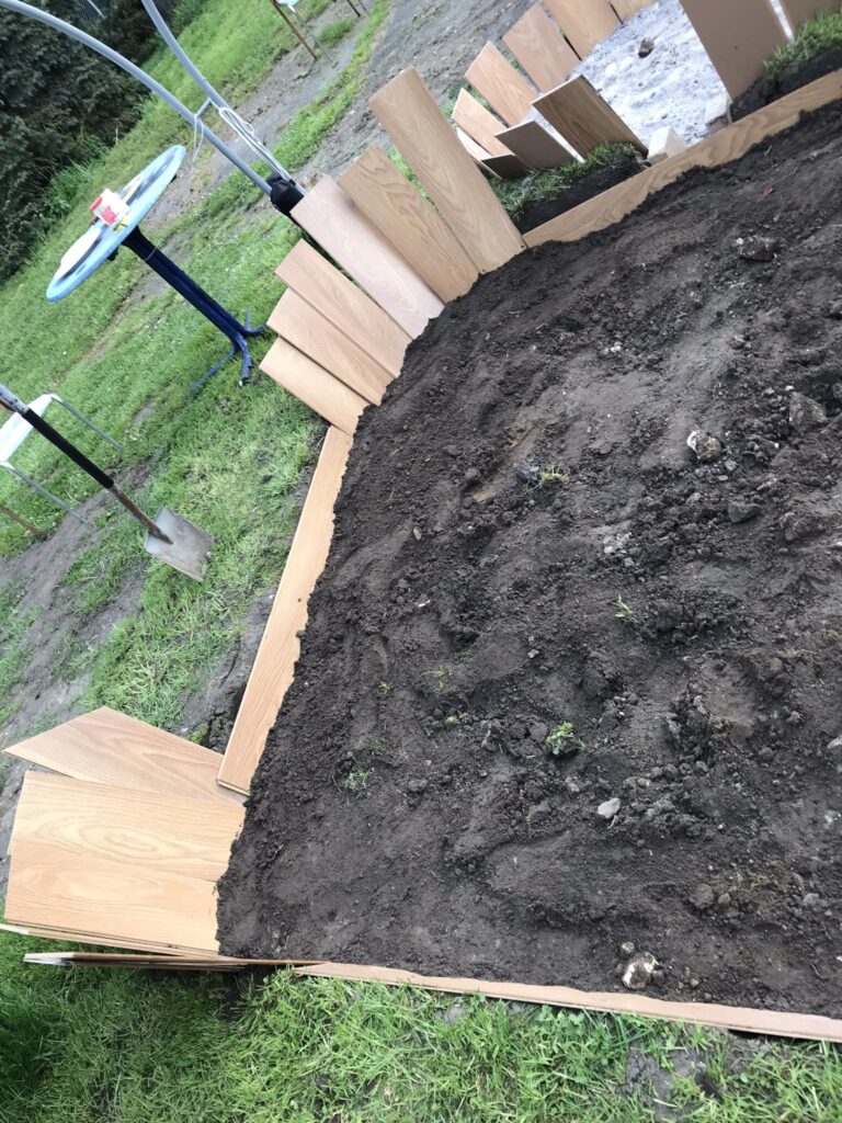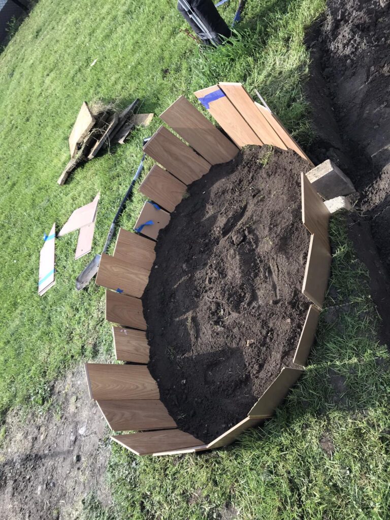 Zastanawiałam się jak zrobić okrąg do wylewki i jak później poukładać deski???? Odpowiedź brzmi: „jakoś to będzie”. Gdy już miałam wygrzebana ziemię rozpoczęłam poszukiwania odpowiednych desek do wykonania szalunku. Nic nie znalazłam oprócz ścinek z paneli, więc trzeba było ich użyć.