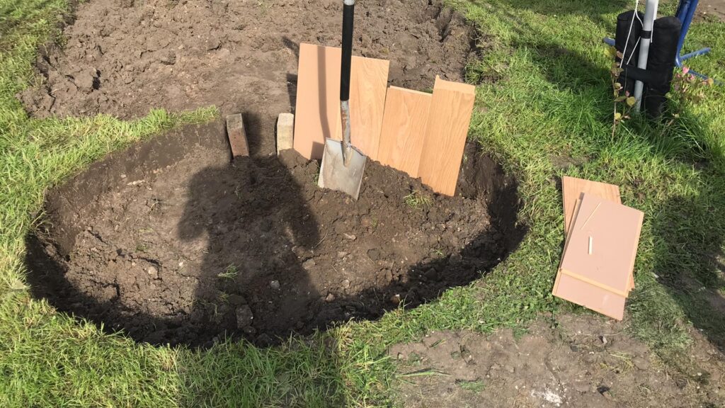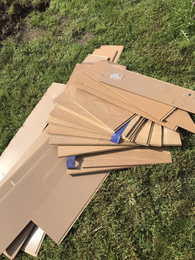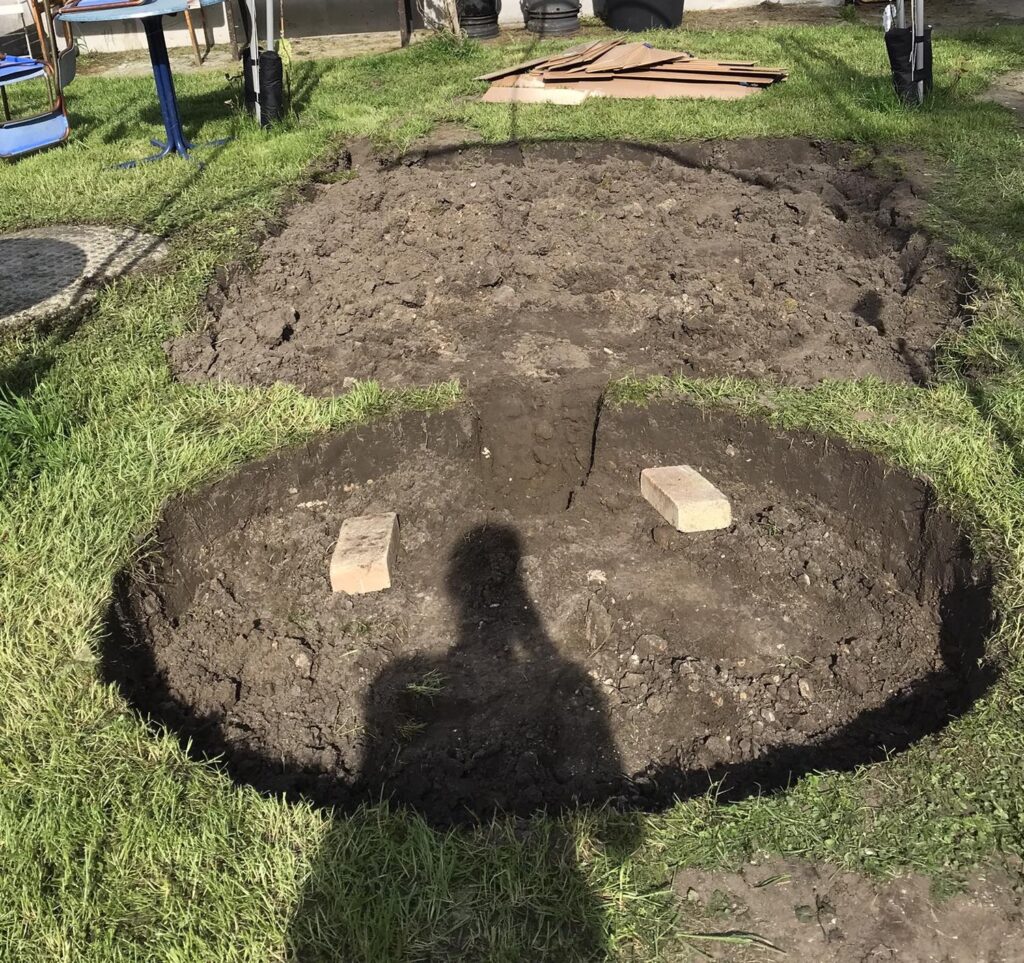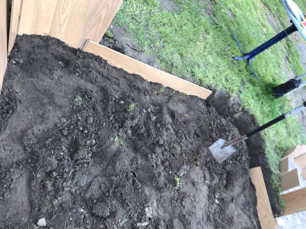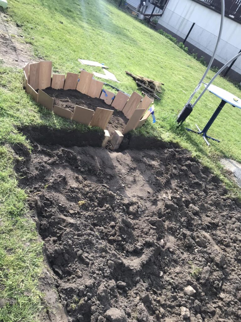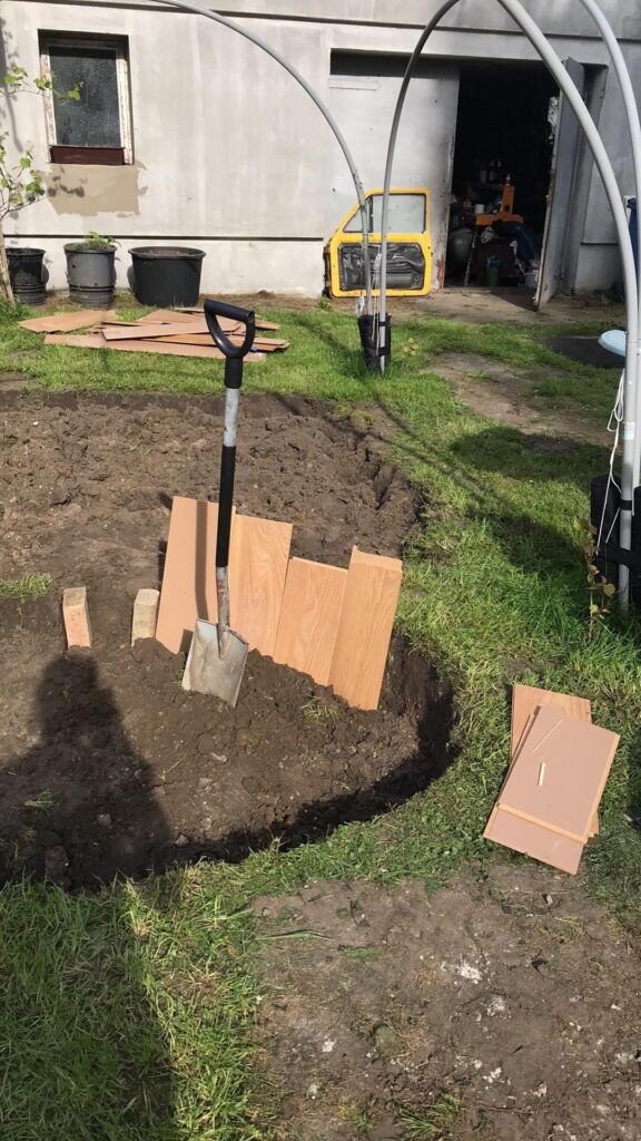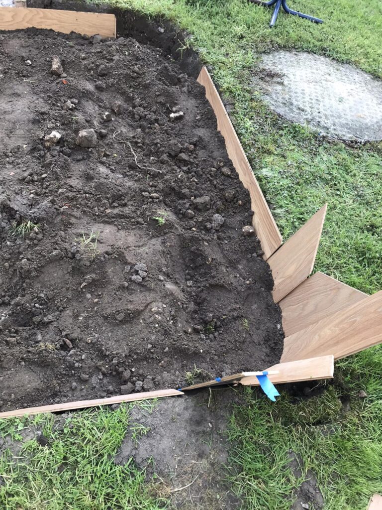 Zastanawiałam się jak zrobić okrąg do wylewki i jak później poukładać deski???? Odpowiedź brzmi: „jakoś to będzie”. Gdy już miałam wygrzebana ziemię rozpoczęłam poszukiwania odpowiednych desek do wykonania szalunku. Nic nie znalazłam oprócz ścinek z paneli, więc trzeba było ich użyć.