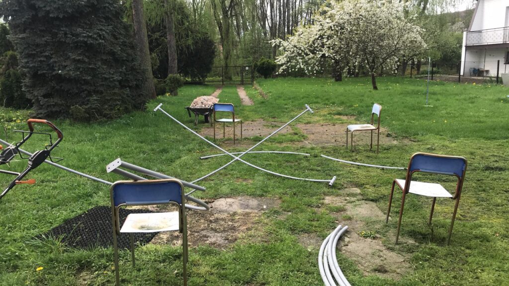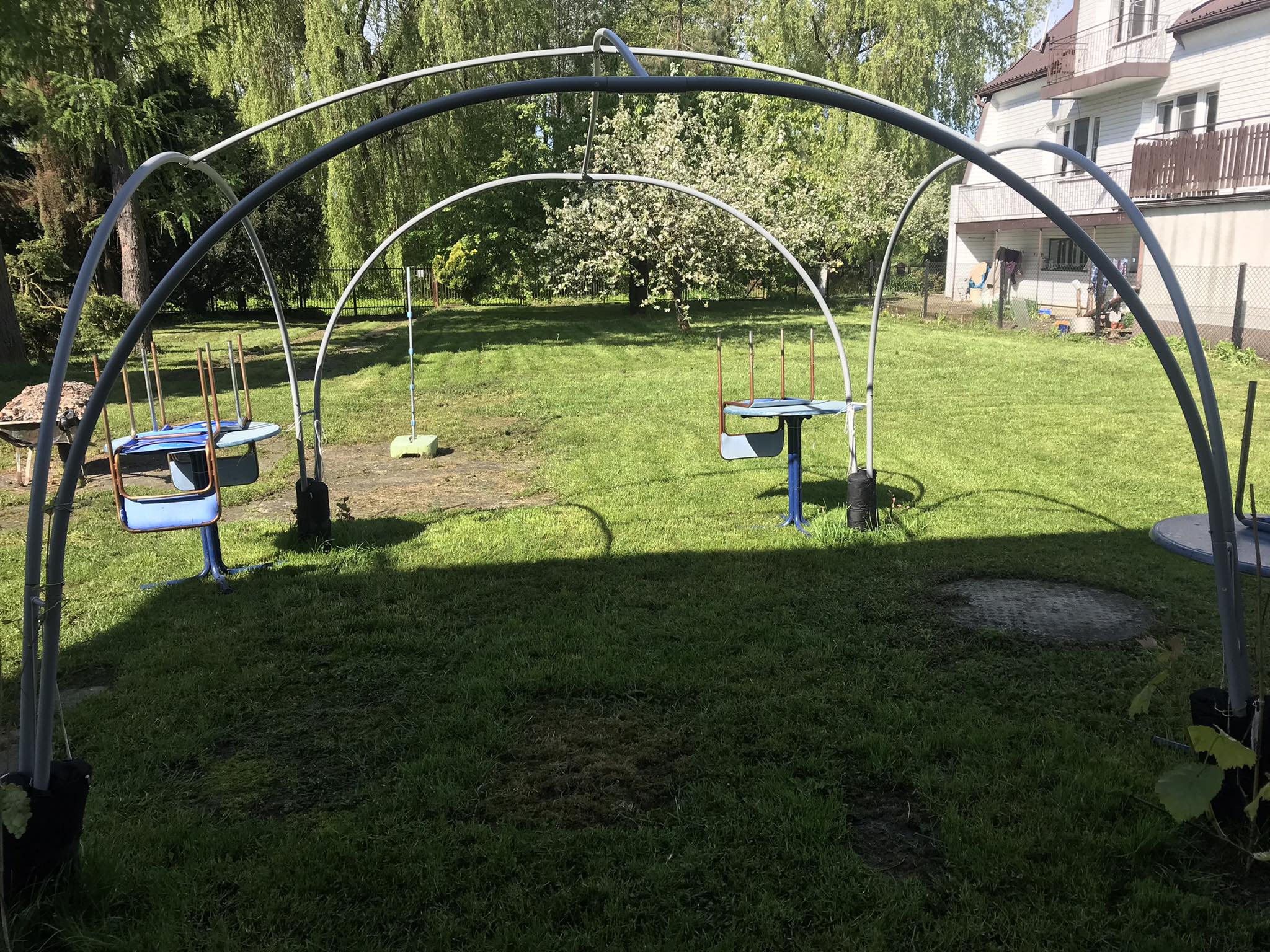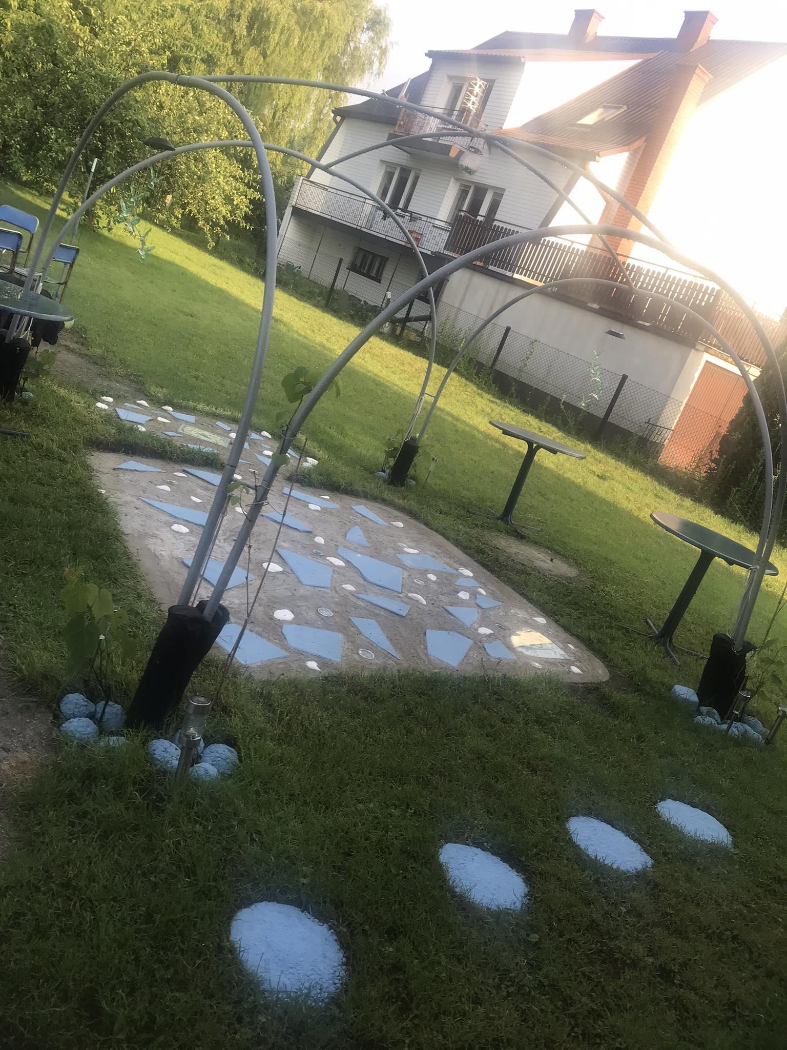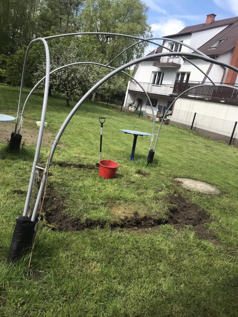 Na tym etapie tworzenia nie nakładam materiału na stelaż altany. Gdy już stelaż został złożony w odpowiedniej pozycji musiałam zaplanować, w który miejscu najlepiej ją ustawić przed domem, żeby było blisko z grilla do domu i w miejscu słonecznym, ponieważ chcę aby były dobrze nasłonecznione winogrona, którymi obsadzę boki altany.