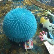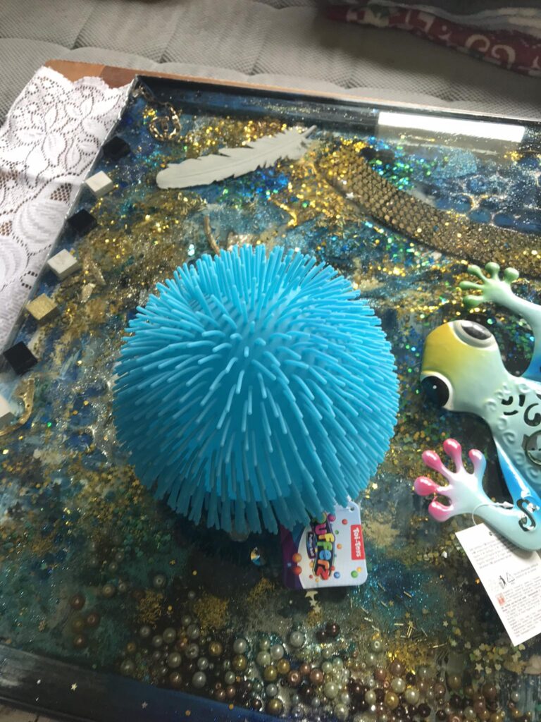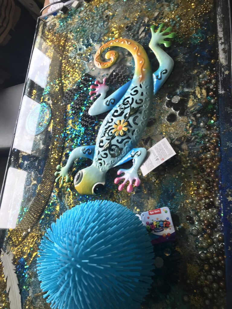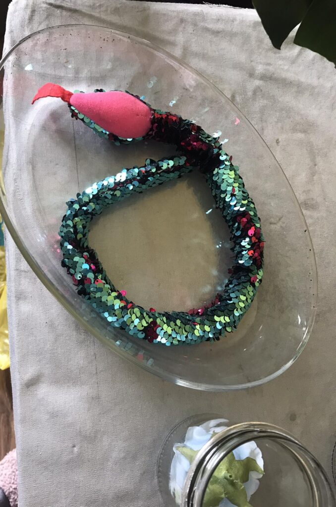 Następnego dnia gdy oczekiwałam już na wyschnięcie żywicy w słoikach, podczas sprzątania domu znalazłam starą zabawkę córki o wyglądzie błękitnego węża. Wspaniale nada się ażeby zatopić ją w podłogę, dlatego dodaję ją również do moich ozdób.
