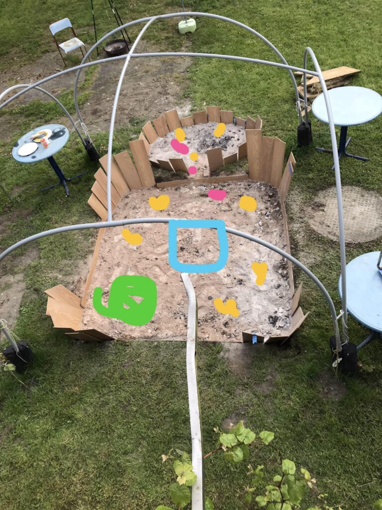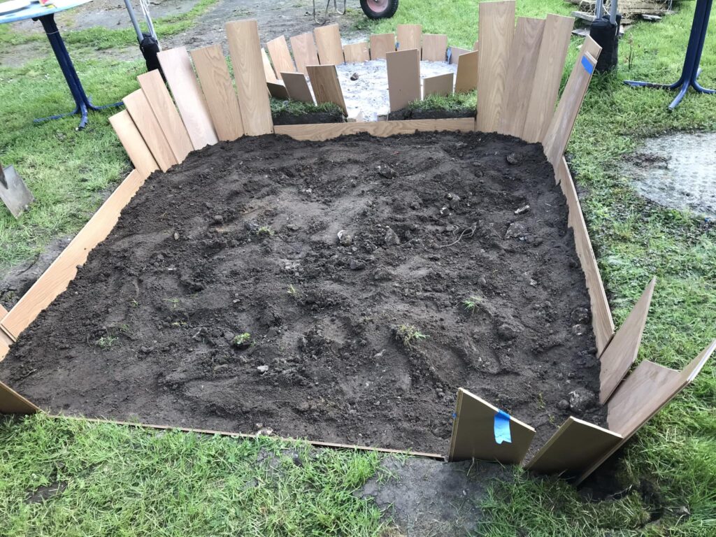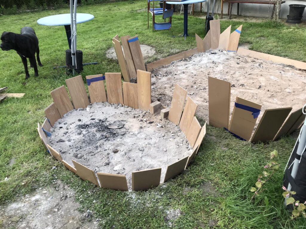 Poukładałam je w wykopanych dziurach jeden koło drugiego. Starałam się jej ułożyć jak najbliżej jeden obok drugiego (na ścisk). Celowo tak ułożyłam ponieważ gdy świeży beton wyleje do dziury, ważne jest aby nie dotykał on ziemi, tylko żeby deski nadały mu kształt i odgrodziły go od niej. Więc kształt układania desek też wyszedł spontanicznie. Podczas pracy wysunęłam takie wnioski, że wykonanie wylewki w okrąg chyba poszło sprawniej, a na pewno lepiej niż we wzorze głównym pod altaną.