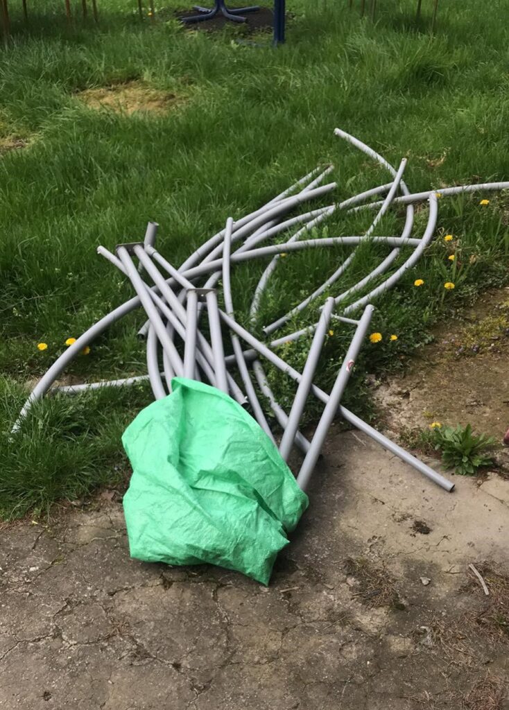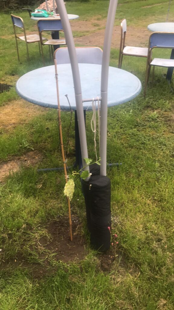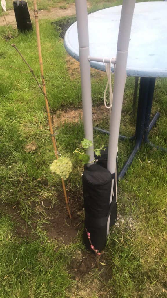 Takie zastosowanie pełniło by funkcję ochronną przed deszczem i słońcem dla osób przebywających w altanie. Po zasadzeniu dodatkowych roślin powstało by mniej dziur w zadaszeniu i altana pełniła by funkcję parasola. Rośliny zostały zakopane tak, aby były w miarę blisko elementów stelażowych, ponieważ chcę żeby w późniejszym czasie z łatwością mogły się wspinać po rurkach i nie będzie trzeba robić dodatkowych wzmocnień i podpórek dla rośliny. Ponieważ zapowiadają silne wiatry musiałam jakość zabezpieczyć altankę.