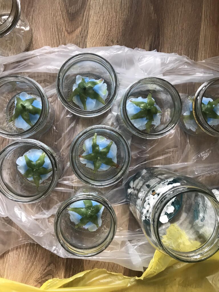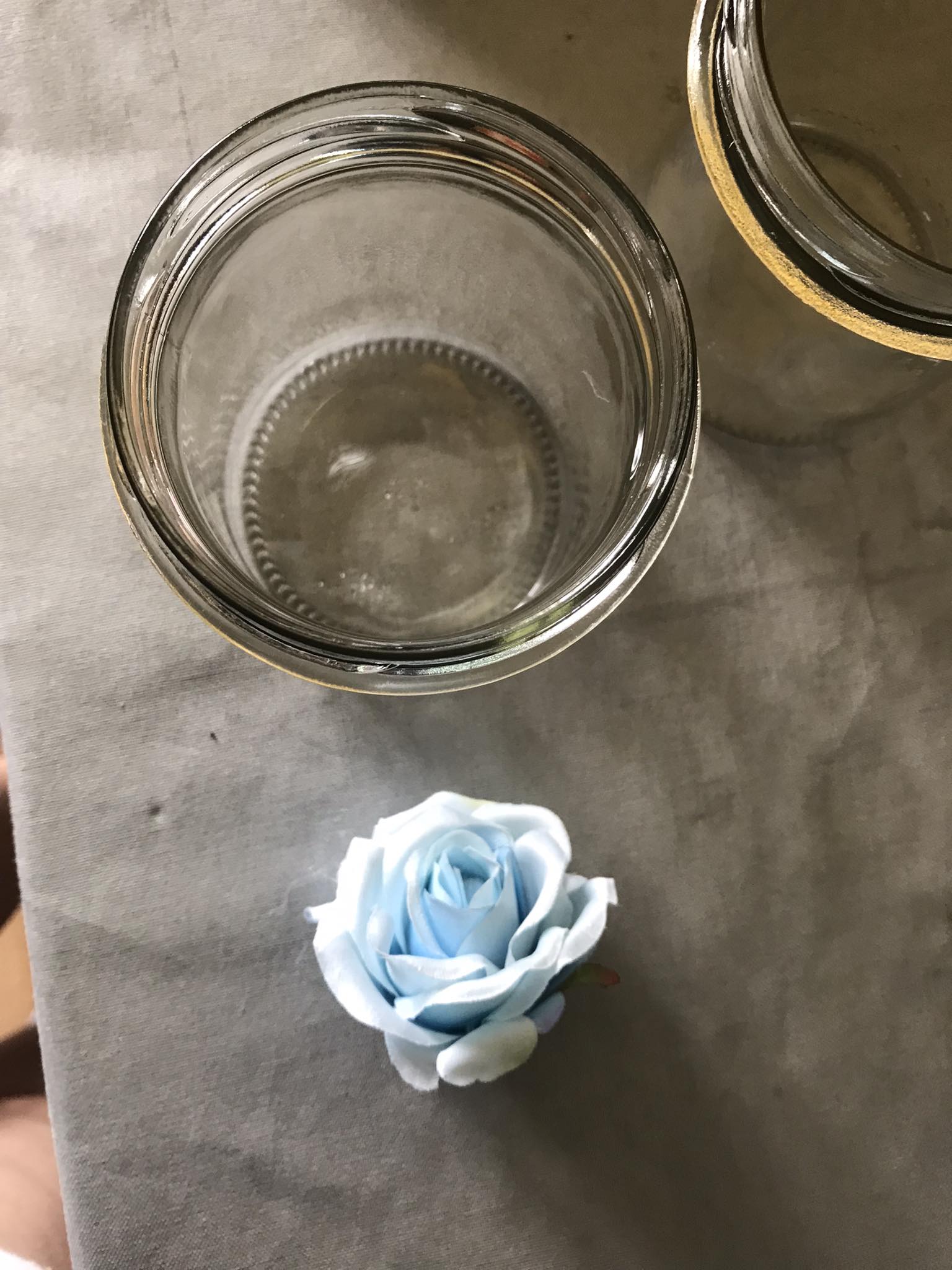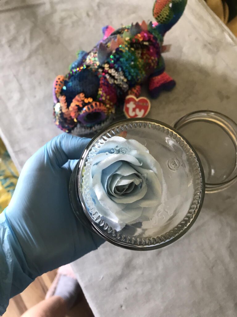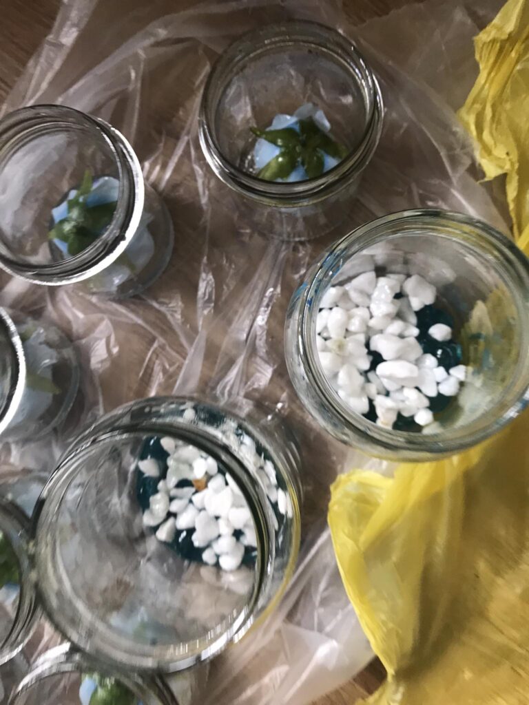 Chciałam żeby altana pasowała do tego drzewka i tak już pozostało. Ale jak zrobić kolorową wylewkę? Na rynku dostępne są farby do betonu, można malować w dowolnych barwach, ale jak zrobić jakiś element żeby na podłodze był widoczny i dość długo wytrzymały na mróz, warunki atmosferyczne i na upływ czasu. Zaczęłam się zastanawiać jaki materiał z łatwością połączył by się z betonem i wymyśliłam. Idealnie do tego nada się szkło. Do szkła można wsadzić coś co ma dla nas satysfakcjonująca barwę, można go zalać betonem, oczyścić i zawartość szkła jest widoczna. Można po tym szkle stąpać, pod warunkiem że ma odpowiedni kształt. Jeśli zatopie w betonie szklaną kulę, to gdy na niej stanę mogę się przewrócić. Ważne jest, aby naczynie szklane było w jednym miejscu płaskie i zrównało się z wylewką. Zaczęłam szukać produktów które i są szklane, w kwadracie, otwierane i można coś do nich wsadzić, potem zamknąć i zalać w betonie. Napotkałam na luksfery, są to już dawno zapomniane płytki szklane. Już chciałam je zakupić i przetestować, ale po dalszej analizie produktu okazało się, że nie są otwierane, więc z nich zrezygnowałam. Nawet dobrze wyszło, bo są dość drogie, a ja nie mam za dużo pieniędzy żeby przeznaczyć na podłogę. Kolejnym moim pomysłem okazały się trafione w dziesiątkę słoiki. Spełniły każdy z moich założeń. I są tanie i odkręcane i szklane. Kupiłam ich 24 sztuki na allegro za 60 zł wraz z dostawą. Zapakowałam do środka błękitne sztuczne różyczki, które zostały mi jeszcze ze stroików. Umieściłam je tak w słoiku, aby po zatopieniu słoika w betonie były widoczne pod dnem. Jeszcze działa na korzyść słoika fakt że jest jego dno jest okrągłe, a taki kształt jest mile widziany w mojej podłodze w altanie. Ale żeby kwiatek po odwróceniu słoika do góry dnem nie poleciał na denko należało go czymś przykleić do tego dna. I tu pomocna okazała się moja żywica epoksydowa. Akurat została mi po robieniu ostatniego stolika. Idealnie się nadaje bo jest krystaliczna, będzie kwiatka widać i połączy się ze szkłem. Zalałam zatem słoiki wypełnione kwiatkiem żywicą i czekałam aż nabierze wiązania.