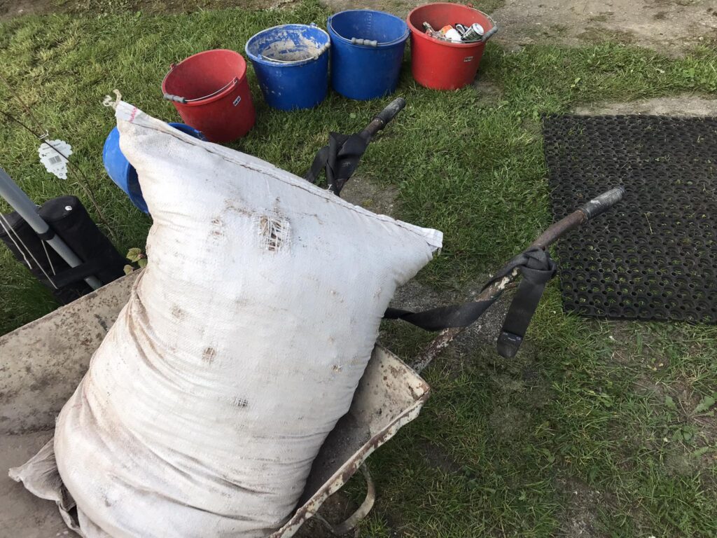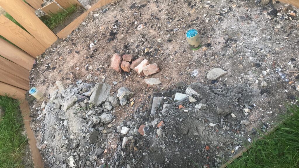 Po umieszczeniu paneli w dziurach zaczęłam wysypywać gruz, miałam go sporo, ponieważ za domem zawaliła się stara wędzarnia, wiec znalazł się ciężki gruz i drobnica. Wysypałam ok 4 taczki, tak aby zostawić miejsce na osadzenie elementów dekoracyjnych oraz wylanie betonu.