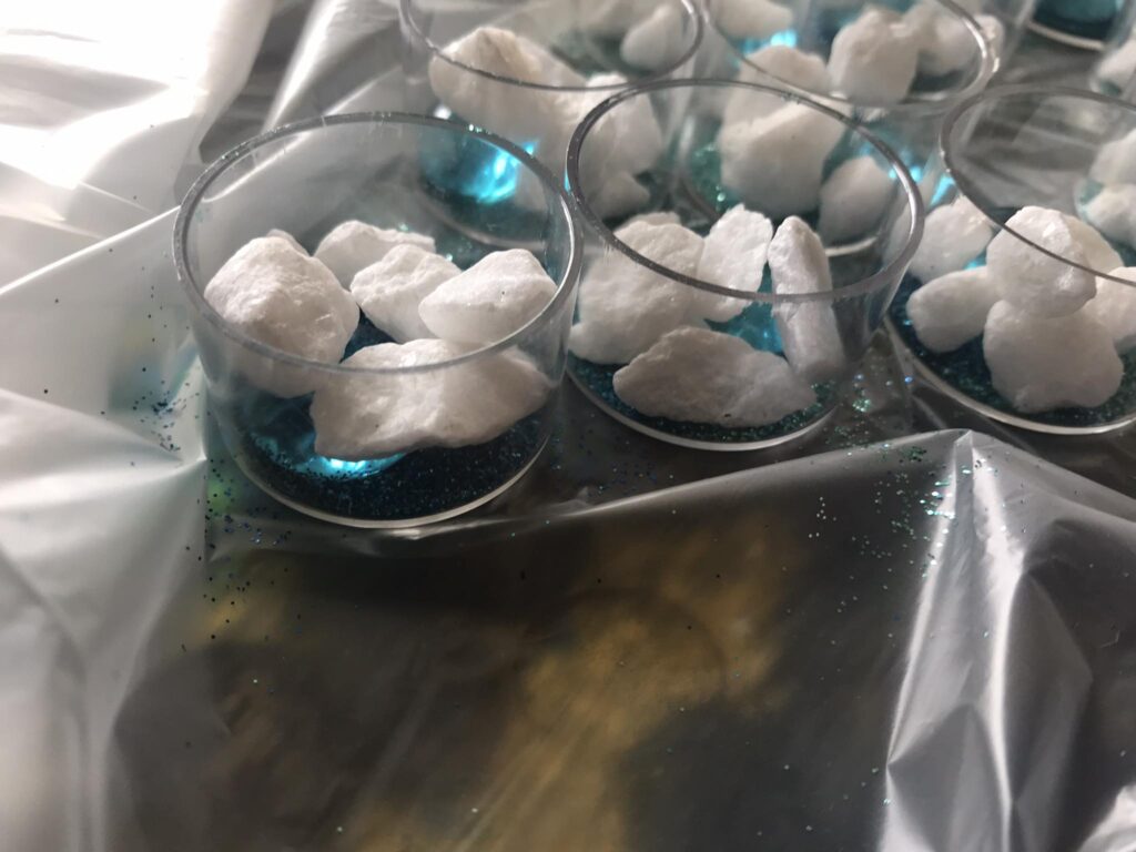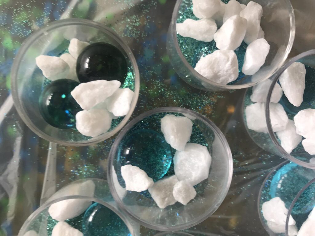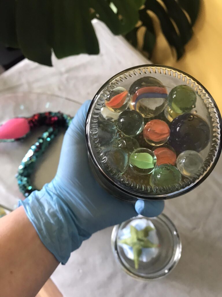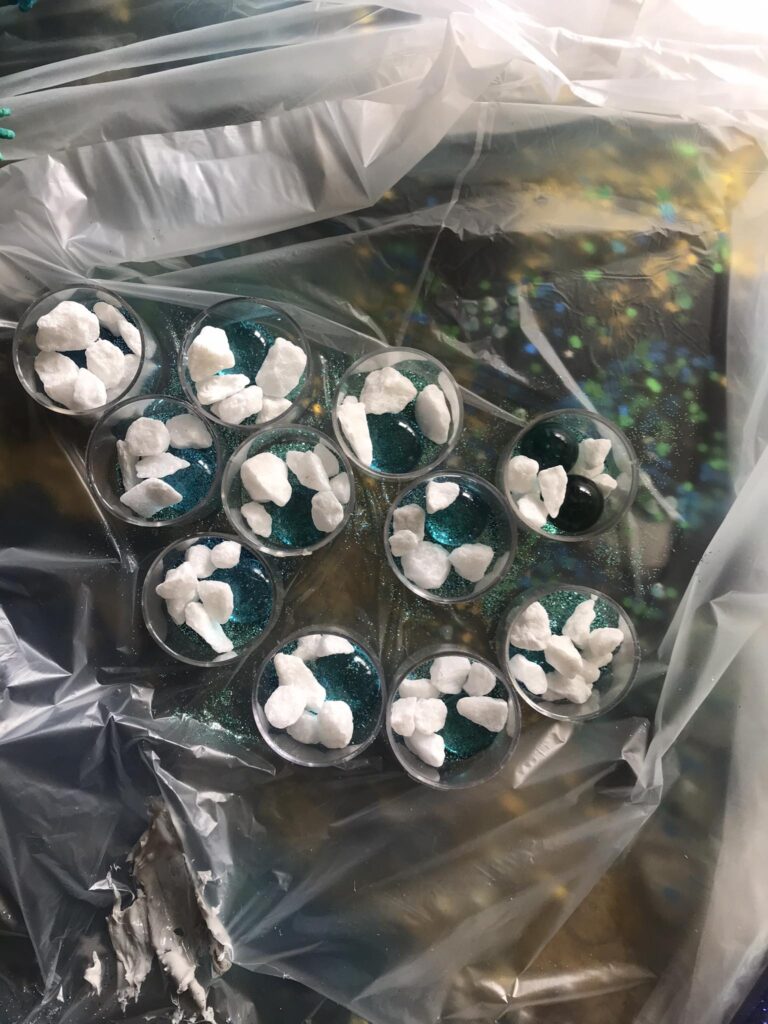 Oczekując na wyschnięcie silikonu z pozostałych pojemniczków wykonałam ozdoby z kamyczków, brokatu oraz szklanych kulek. W tych ozdobach ważne jest również, aby zabezpieczyć je przed możliwą wilgocią, więc szczelnię wypełniłam ich wlot silikonem. Gdy już silikon wyschnie kilka z nich planuje umieścić w moim dekorze między jaszczurkami.