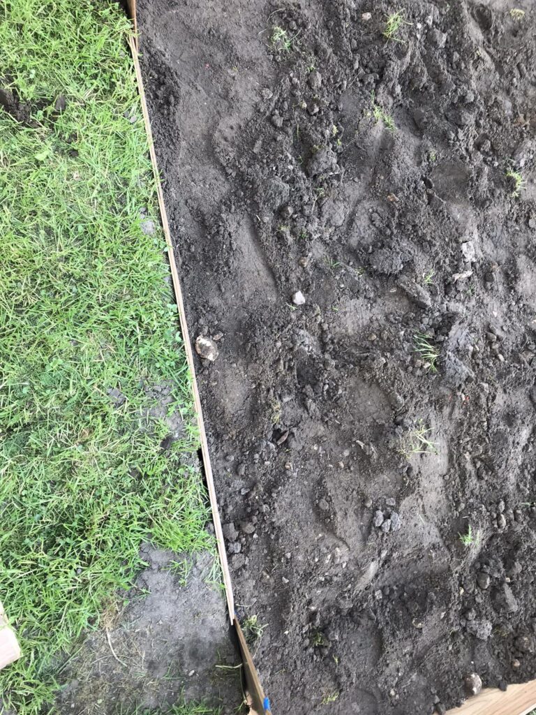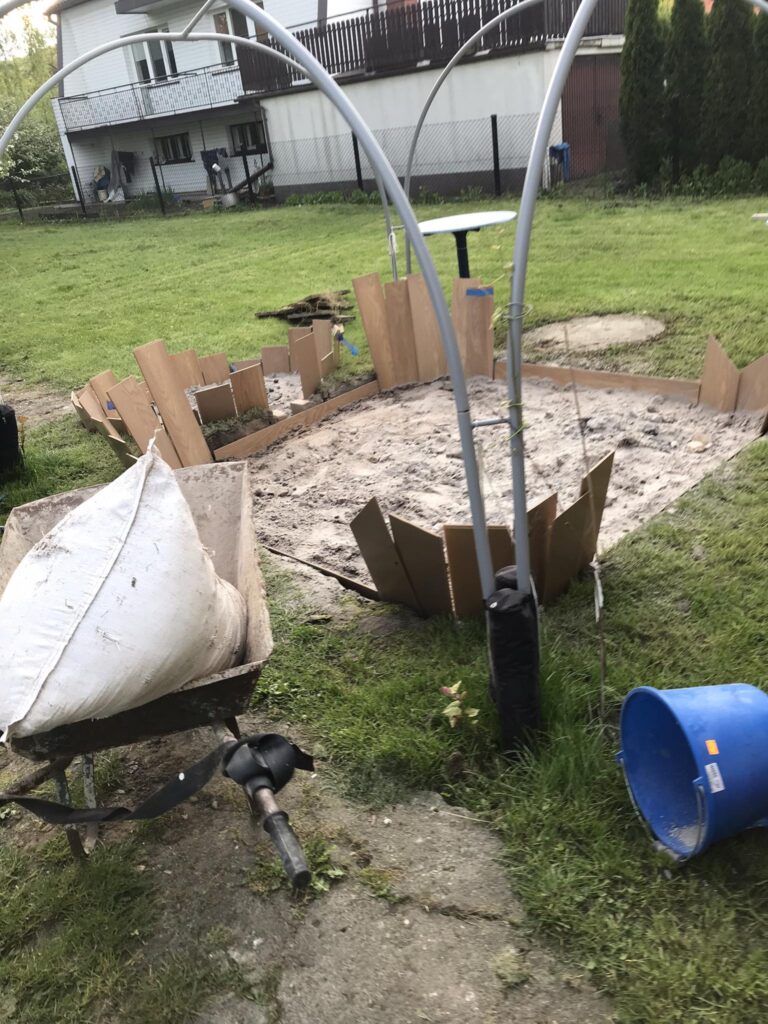 W sytuacji, gdy trzeba było wykonać łuki zrobiły się „schody”, a nawet pokrzywione deski, wiec pomyślałam, że dobrze wykonane będą również nachodzące się na siebie panele, które później będzie można z łatwością odciągnąć od gotowej wylewki. Na cztery boki po prostu wsadziłam ułożone w poziomie deski zrównane z powierzchnią ziemi, aby już ich nie wyciągać i nie szarpać się z nimi po wyschnięciu cementu, nie wiem jeszcze czy będzie szło opornie ich rozłączenie.