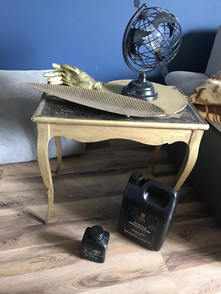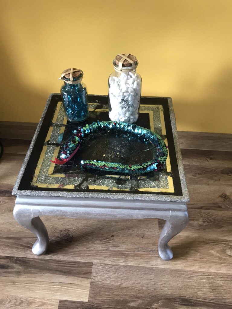 Szybę następnie posypałam brokatem i aby przykleić pojemniczki do szkła użyłam silikonu. Zrobiłam tak dlatego, żeby szary silikon pod szybą wymieszał się z brokatem i zrobił fajny efekt, bo pamiętam swój cel projektu podłogi: „ma sie błyszczeć“.