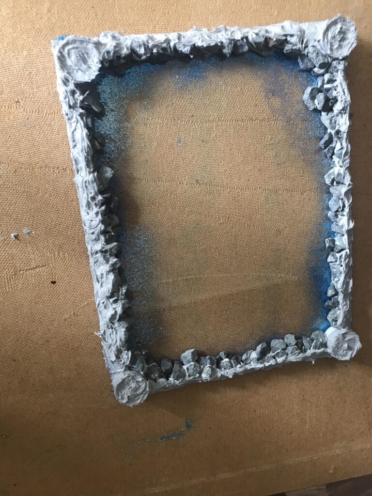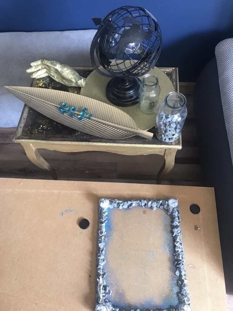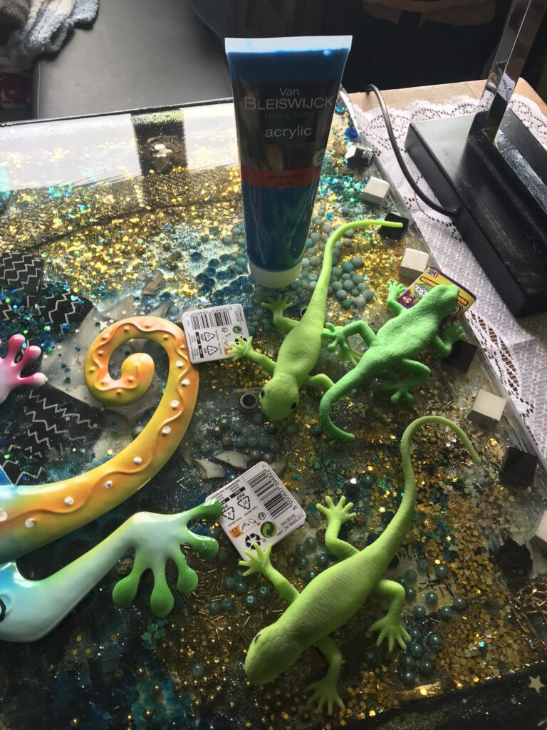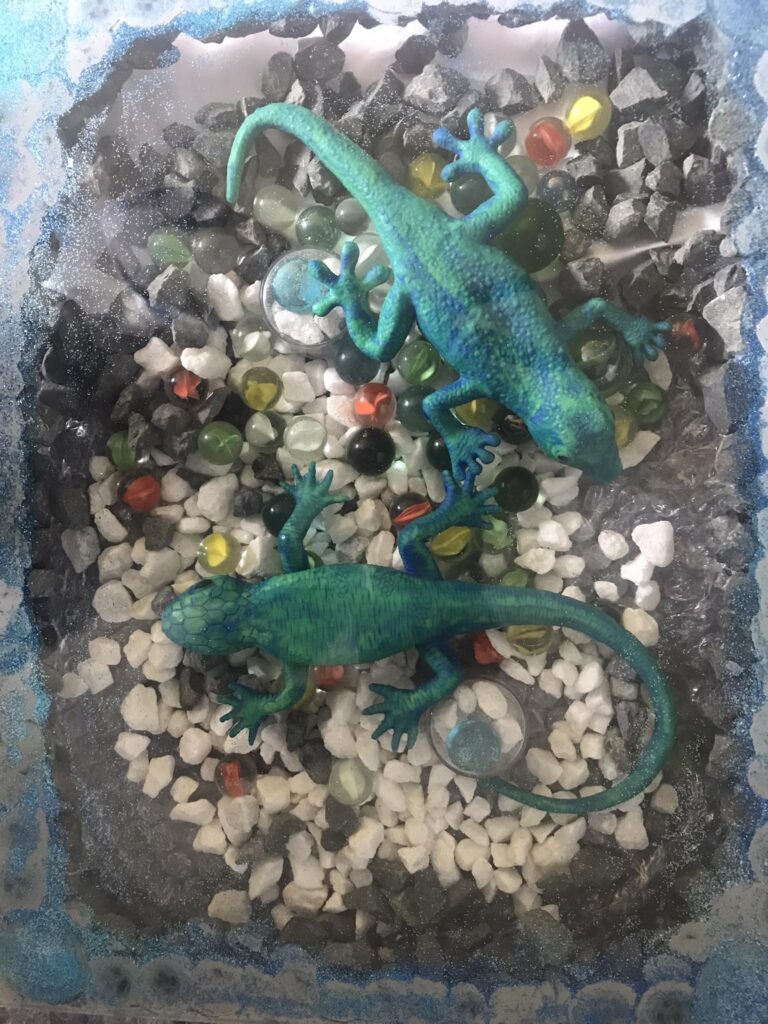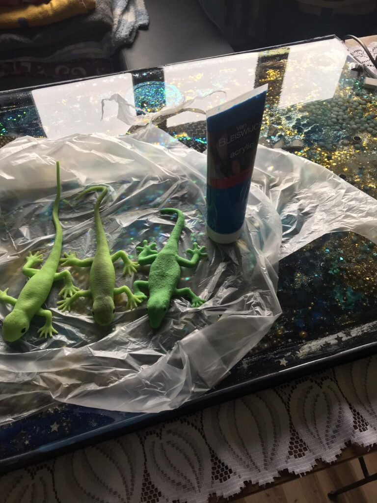 Następnie zalewam małą ilością żywicy moją szybkę, po czym lokuje w środku jaszczurki wraz z ozdobnymi pudełkami, przekładam kamyczkami białego grysu. Warstwami umieszczam kamyki, silikon bezbarwny i przelewam je żywicą, żeby je w całości zespoić. Na końcu prac na spodzie całości konstrukcji podobnej do terrarium, wypełnię całe dno silikonem. I gotowe.