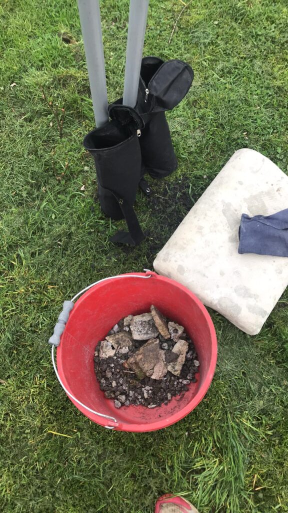 Oprócz tego że przywiązałam jej boki do ciężkich metalowych stolików, to również zakupiłam na allegro obciążniki do altany, na każdy bok w cenie 82 zł za komplet z dostawą. Napchałam do środka kamieni, piasku i gruzu. Przy takim obciążeniu altany jestem spokojna, że przy silnych podmuchach wiatru altanka będzie wciąż stała na swoim miejscu.
